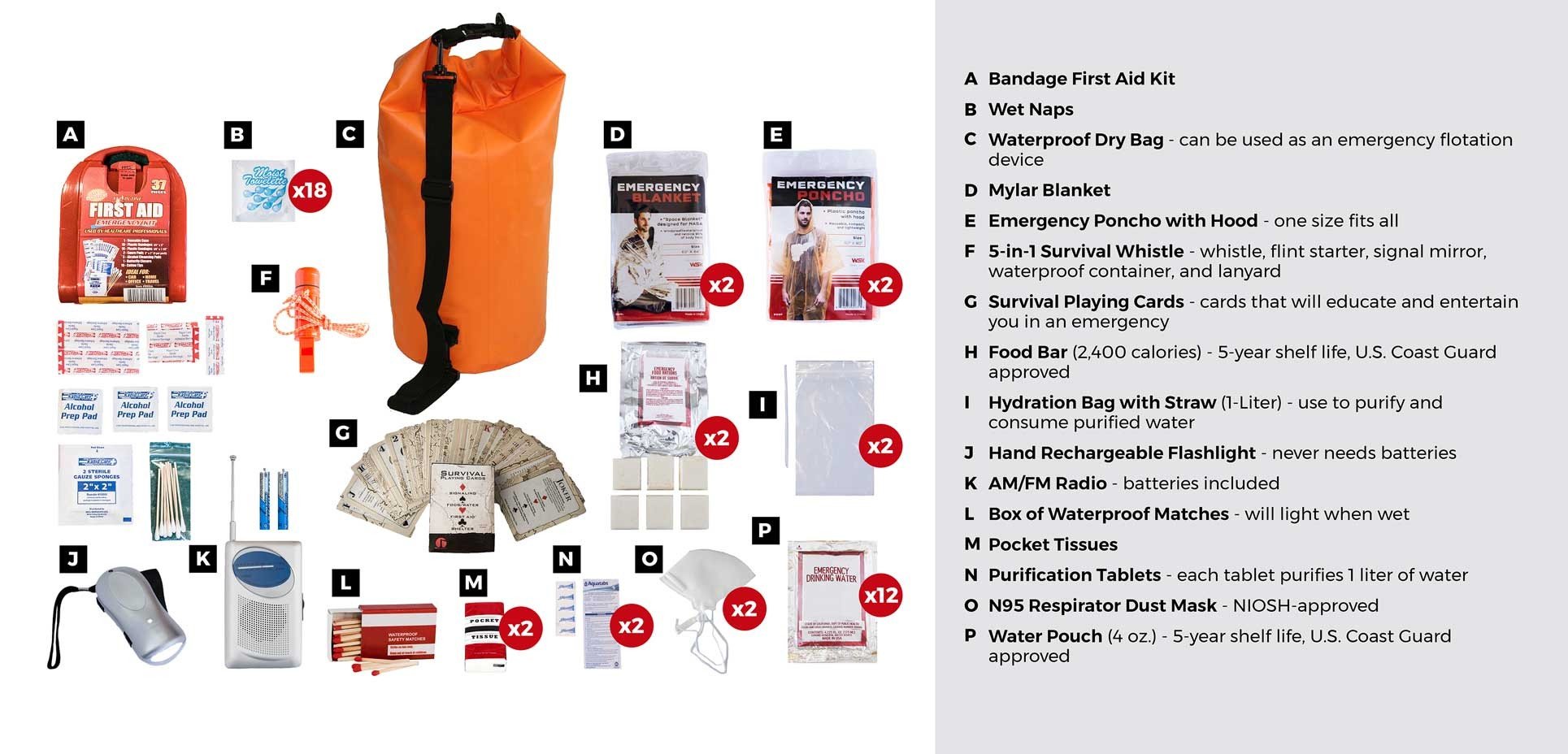 This kit was designed using advice from experts in the field of emergency preparedness. It follows guidelines offered by government agencies and non-profit preparedness organizations. This 2-person emergency kit has a retail value of $89.