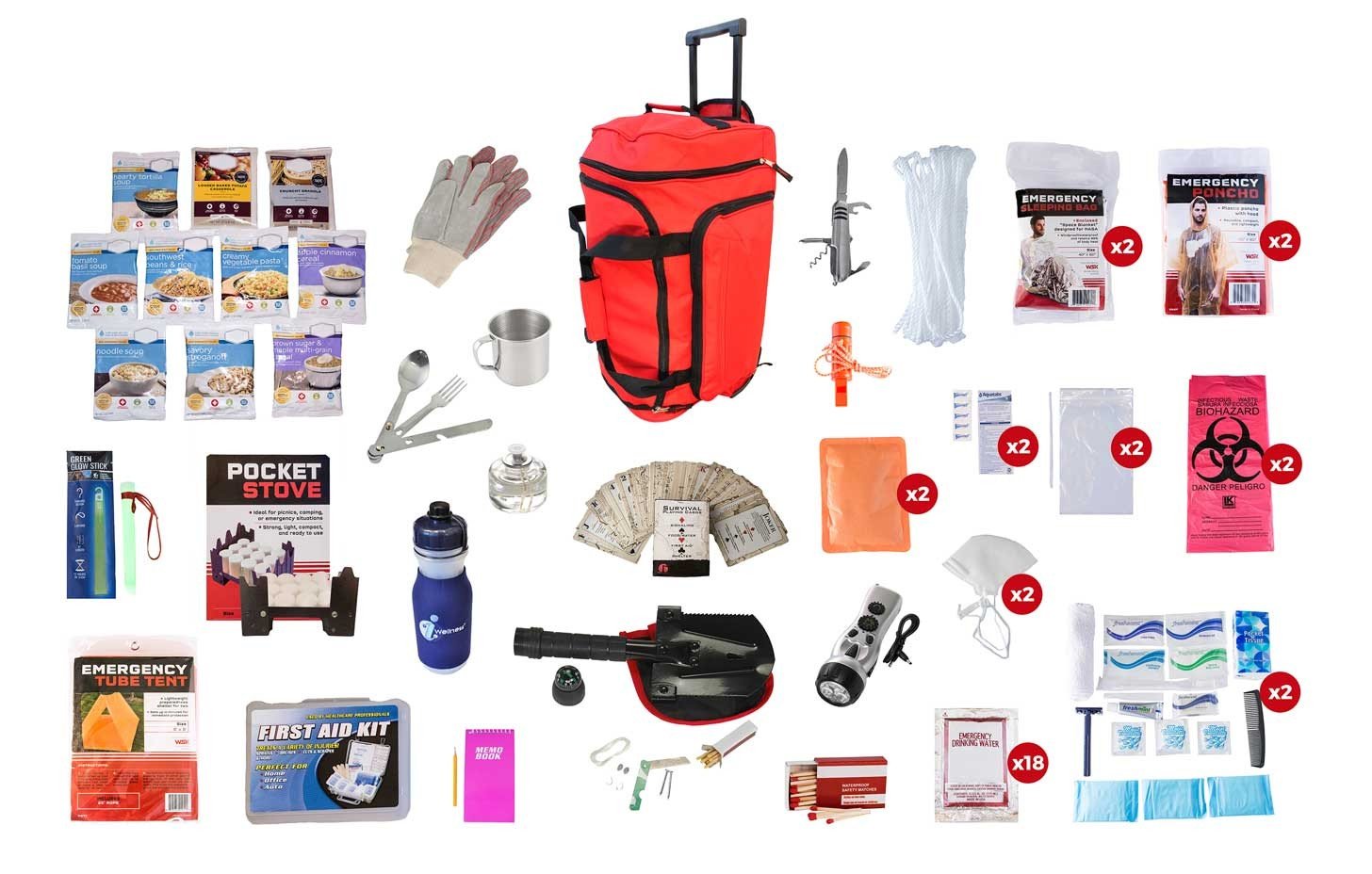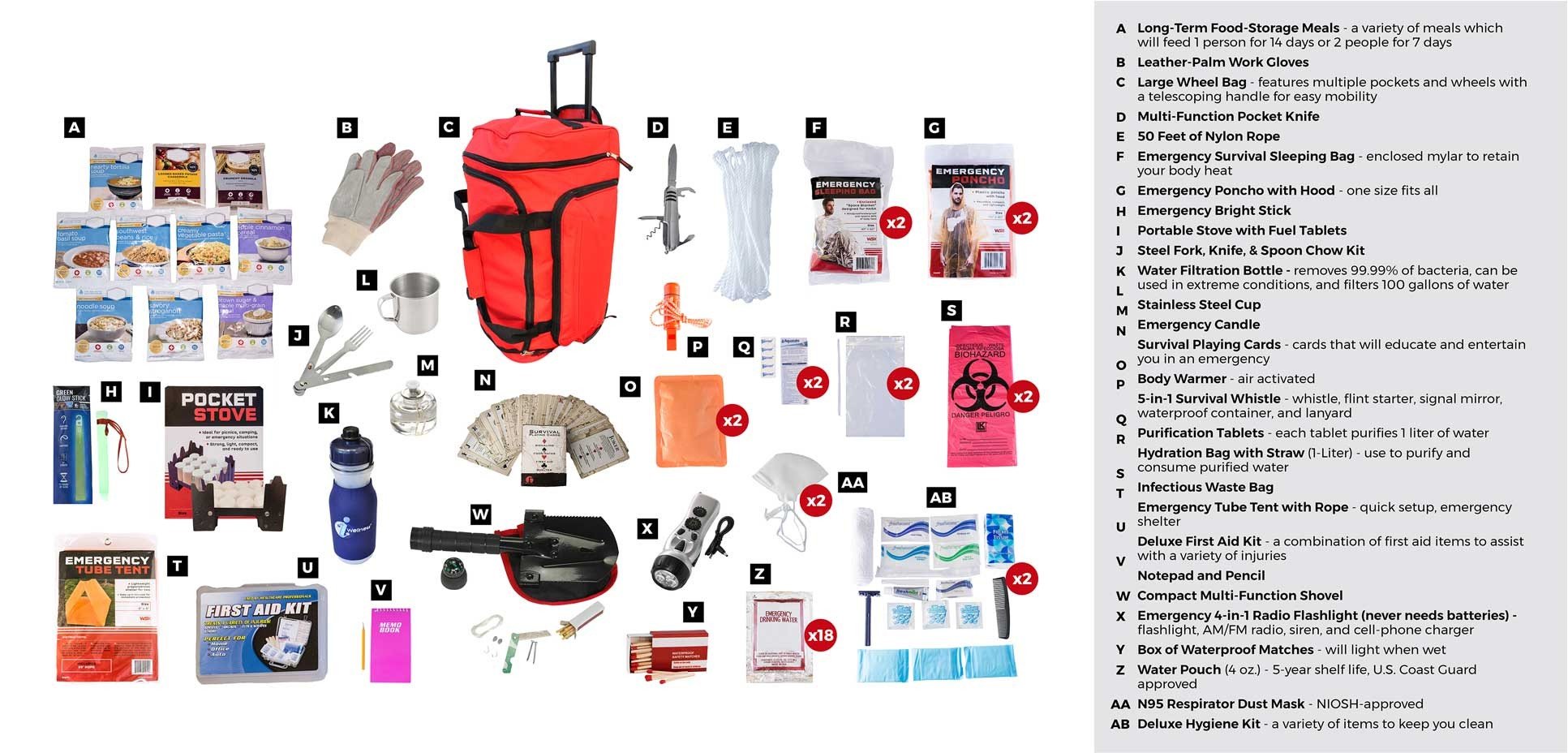 Food and Water: This kit contains 44 Long-Term Food-Storage Meals which will feed 1 person for 14 days or 2 people for 7 days. These products have a 7-year shelf life.