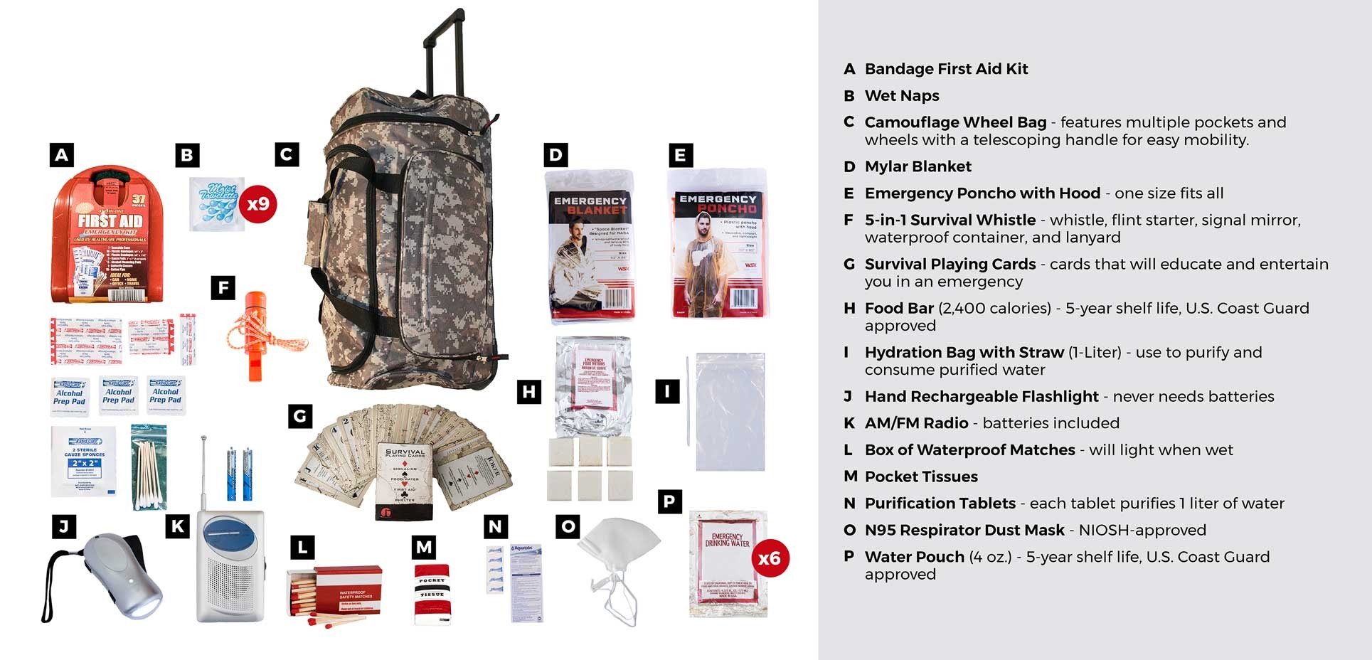 This kit was designed using advice from experts in the field of emergency preparedness. It follows guidelines offered by government agencies and nonprofit preparedness organizations. This 1-person emergency kit has a retail value of $69.